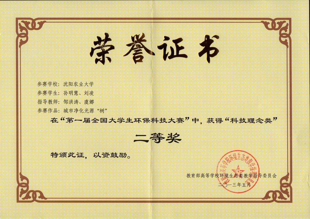 两件参赛作品均获得二等奖,分别是由刘鸣达老师指导的2010级环境科学专业梁佳、2009级环境科学专业张胜完成的“沈阳市东陵公园森林生态系统服务功能价值评估”,以及由邹洪涛老师指导的2010级环境科学专业孙明慧、2010级环境工程专业刘凌完成的“城市净化光源‘树’”。