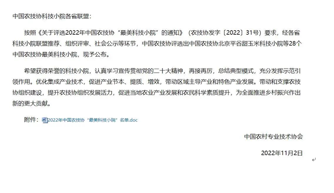 2022年“最美科技小院”评选于7月29日启动,全国共有359家科技小院参评,28家科技小院获“最美科技小院”称号。评选活动旨在提炼一批可复制可推广的科技小院模式,强化典型样板案例的示范引领作用,促进乡村人才振兴和产业振兴。