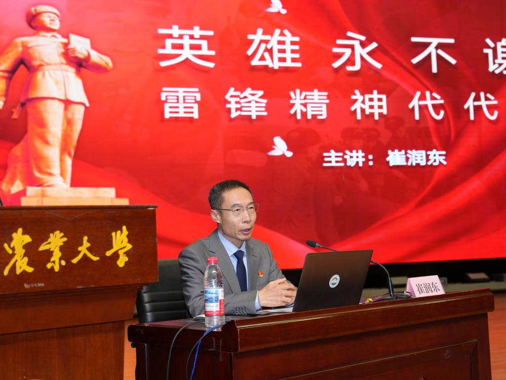 崔润东教授以《英雄永不谢幕,雷锋精神代代相传》为题,围绕“雷锋,我们怀念你”“雷锋,我们学习你”“雷锋,我们成为你”三大篇章,创新运用“音乐+事迹+影像”沉浸式形式,将经典旋律与感人故事深度融合,深刻阐释雷锋精神的时代内涵与价值。报告生动讲述了金城龙同志忠诚担当、无私奉献、一心为民的先进事迹,现场带领全体师生齐唱《学习雷锋好榜样》,为在场师生献上一堂直击心灵、催人奋进的思政课、信仰课、成长课。报告结束后,学生代表主动上台献花,向老师致以诚挚敬意。