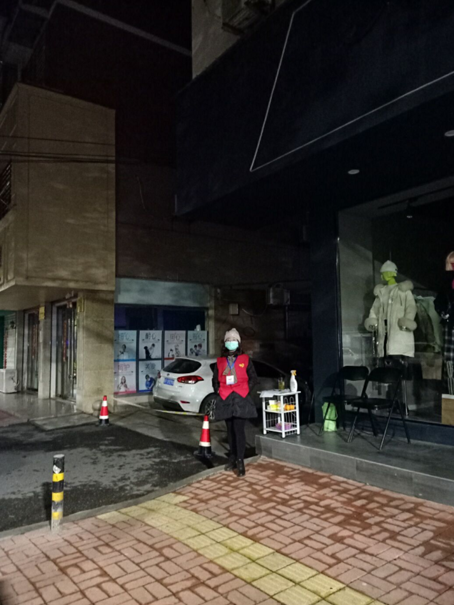 她们的器材很简陋,只是在社区门口用警戒带拉了起来,留着一人出入的小路口,在路口旁支了一个小桌子方便记录。因为当下口罩很稀少,她们没有能力提供口罩给未戴口罩者,所以她们看到没有戴口罩的人就对他们进行拦截,不让他们出门。对于戴口罩者来说,她们只要严格控制他们一天只出入一次这个数量就可以了,但是在外的时间她们也会记录,尽量劝阻小区居民早点回家。对于进入社区的人,她们会进行询问,如果不是本社区的就不让进,如果是本社区的居民,她们将对归来者进行酒精喷洒全身消毒。