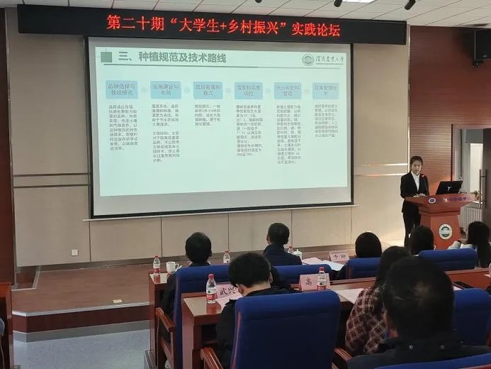 的宫房村调研小组、七顶山村调研小组、棠溪村调研小组以及生物科学技术学院的顺城区调研小组。汇报人进行调研成果分享、视频展示,学生代表针对汇报内容提出问题,汇报人解答,服务乡村振兴博士团成员补充解答。