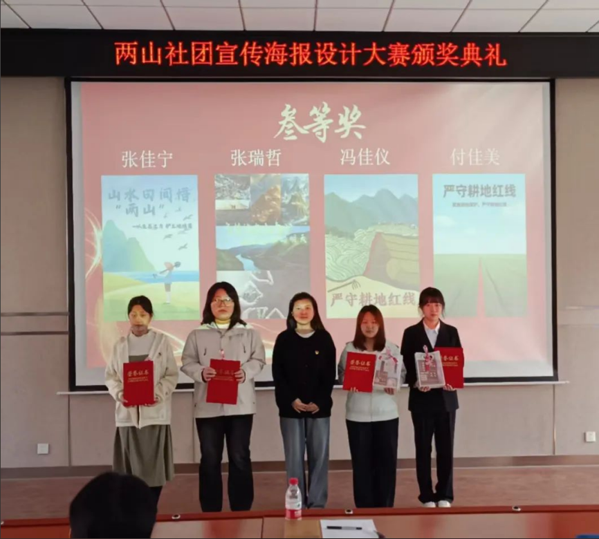 活动期间,全校同学积极响应,用画笔和创意诠释着对土地保护的深刻理解。从报名时的踊跃参与,到创作阶段的精心构思,每一个环节都凝聚着同学们对土地的热爱。一张张精美的海报,不仅承载着独特的创作理念,而且传递着土地保护的强烈信号。评委小组从主题契合度、创意性等多个维度进行评审,最终评选出一等奖2个、二等奖4个、三等奖4个。颁奖典礼上,社团指导教师葛新老师为获奖者颁发荣誉证书和奖品。